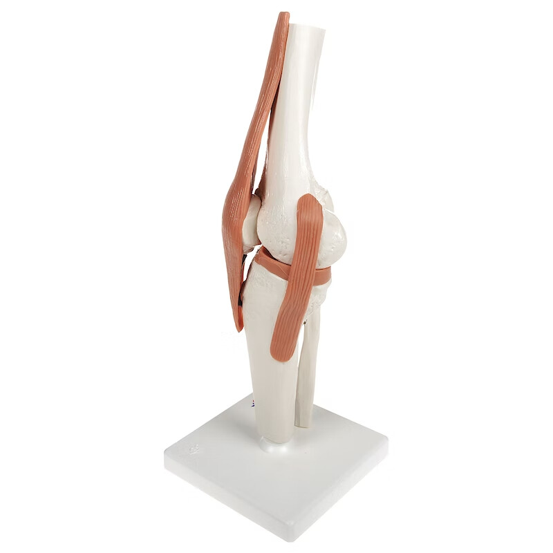 Modèle classique de genou grandeur nature de 3B Scientific, comprenant une partie du fémur, du tibia, du péroné, ainsi que les ligaments collatéraux, les ligaments croisés, les ménisques et le tendon du quadriceps avec rotule. Ce modèle de genou est mobile