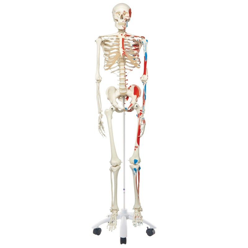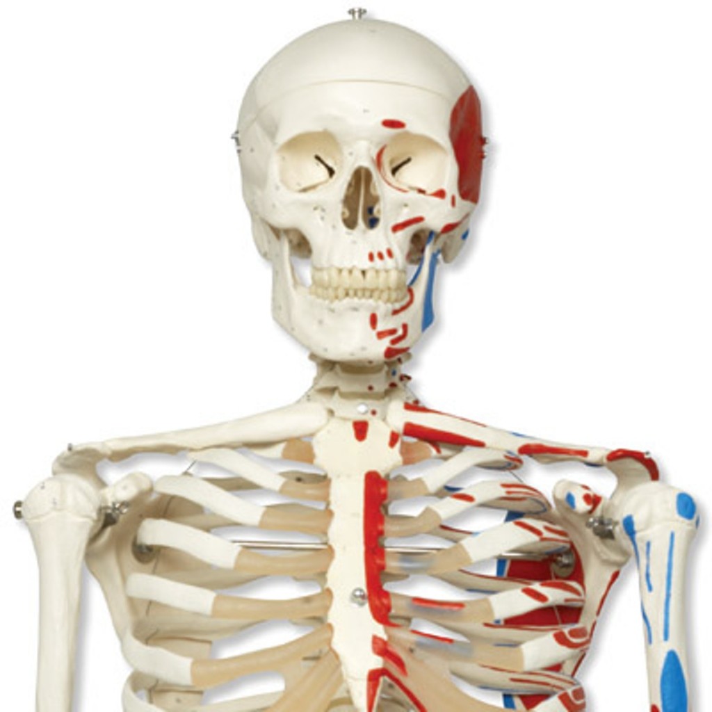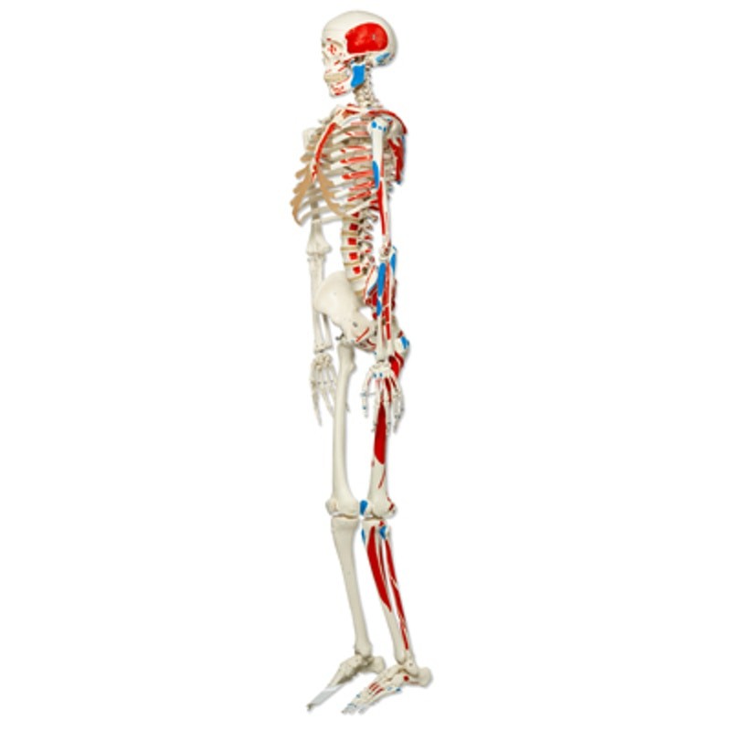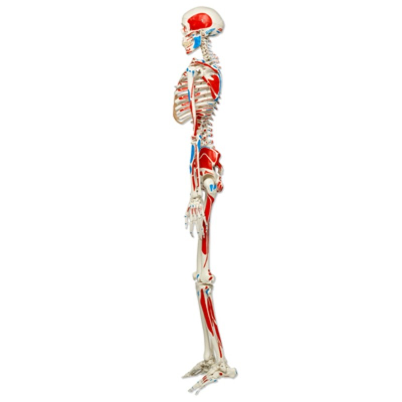 Les extrémités du squelette sont fixées au torse par des boucles métalliques qui facilitent la mobilité et le démontage. Les articulations du coude, du poignet et du genou peuvent être pliées naturellement. De plus, tous les os du côté gauche sont peints à la main en rouge pour les origines musculaires et en bleu pour les attaches. Plus de 600 structures anatomiques et médicales importantes sont illustrées.
