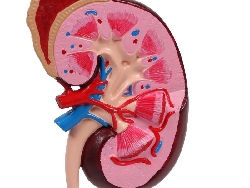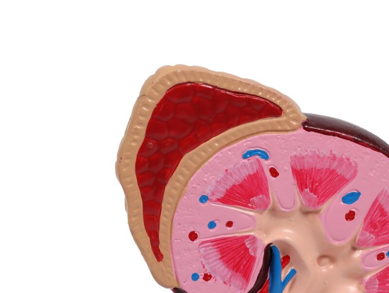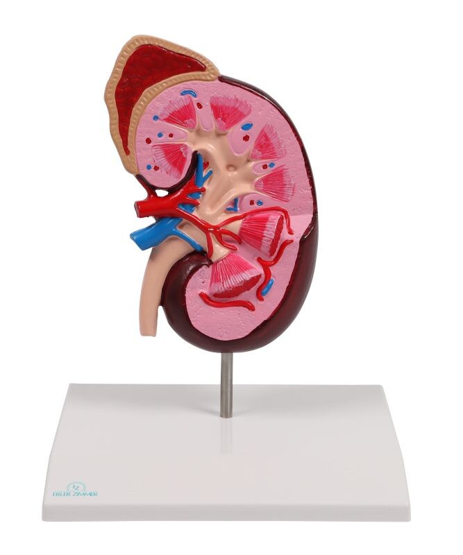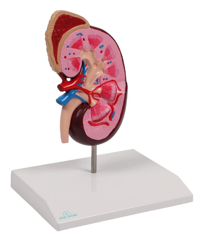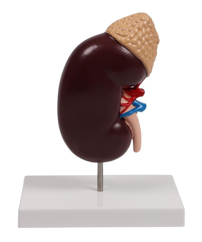 Ce modèle de rein humain, environ deux fois plus grand que nature, présente des détails peints à la main du bassinet, de la médullaire, du bassinet, du cortex rénal, de l'artère et de la veine rénales, de l'uretère et de la glande surrénale. Avec fiche pédagogique et support.