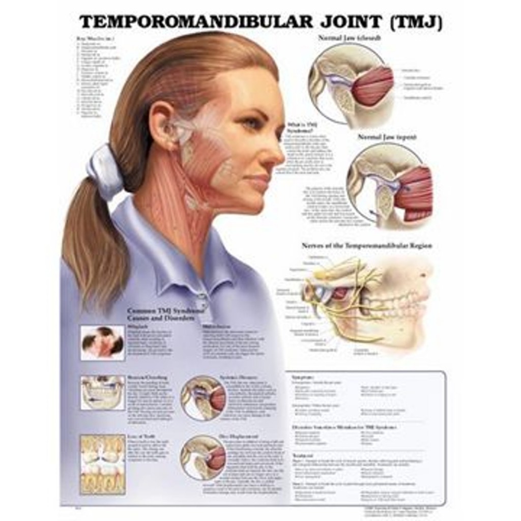 Une mâchoire normale est illustrée en positions ouverte et fermée, ainsi que les nerfs environnants souvent à l'origine des problèmes. L'affiche inclut une liste de symptômes et d'autres affections pouvant être confondues avec l'ATM. Les options de traitement sont également présentées.