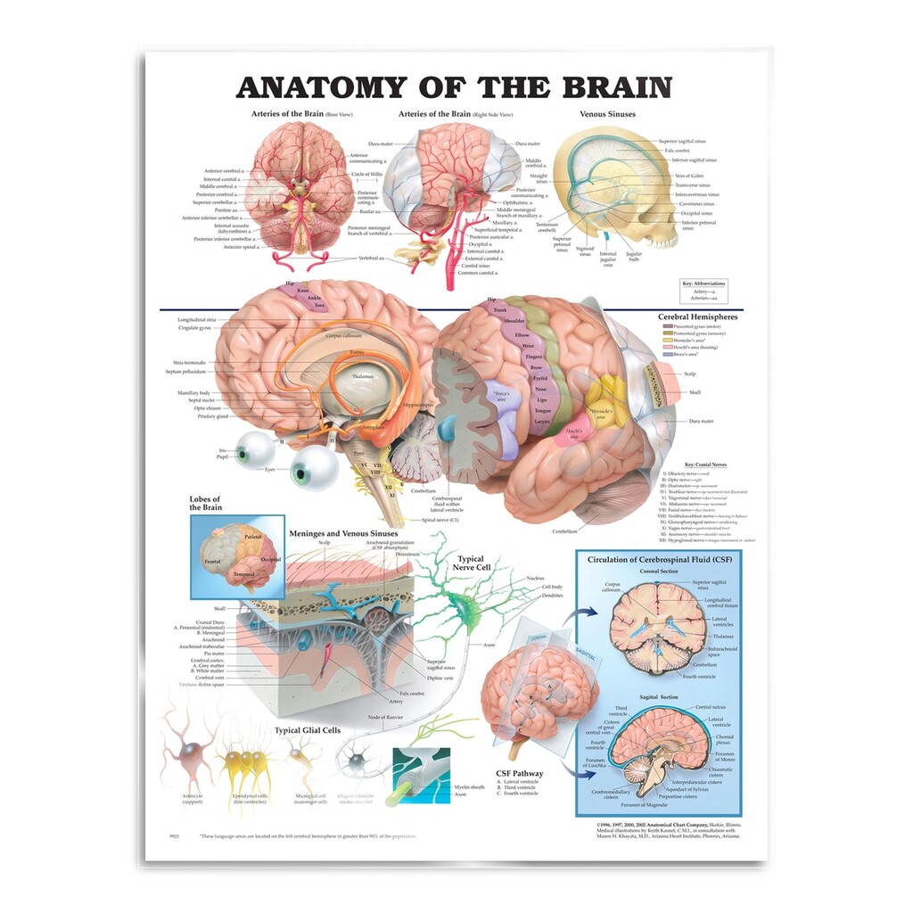 Affiche Anatomie du cerveau en film PET brillant (Anatomie du cerveau). Cette affiche montre les artères et les sinus veineux du cerveau vus de dessous et du côté droit. Elle illustre également les hémisphères cérébraux, les lobes cérébraux, une coupe tran